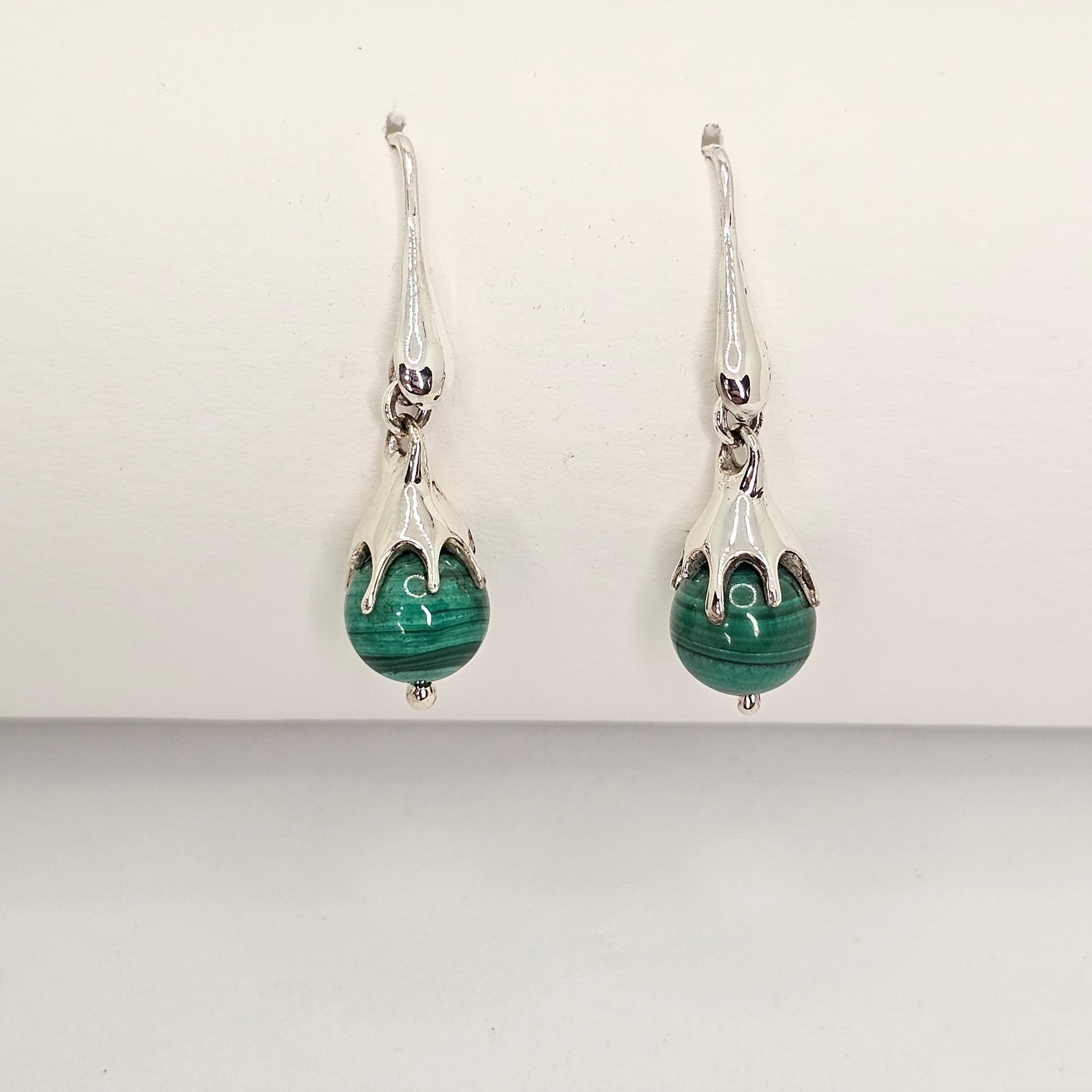 Pair of 925 silver earrings rhodium-plated with white gold and malachite.